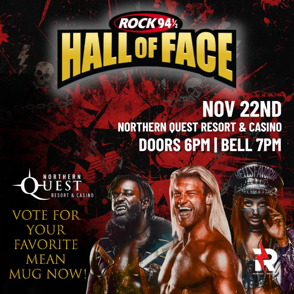 Vote for your favorite mean mug in the Rock 94 1/2 Hall of Face. The pic with the most votes scores stubs and an upgrade to a Relentless Wrestling: Pinnacle II VIP experience on Snowvember 22 at Northern Quest Resort and Casino. 2nd and 3rd place runners-up will score stubs. And just for voting, you will be entered into the Random Name Generator for seats, too. Or you can lock in your stubs now HERE. Voting ends on Friday, Snowvember 14 at 5 PM.